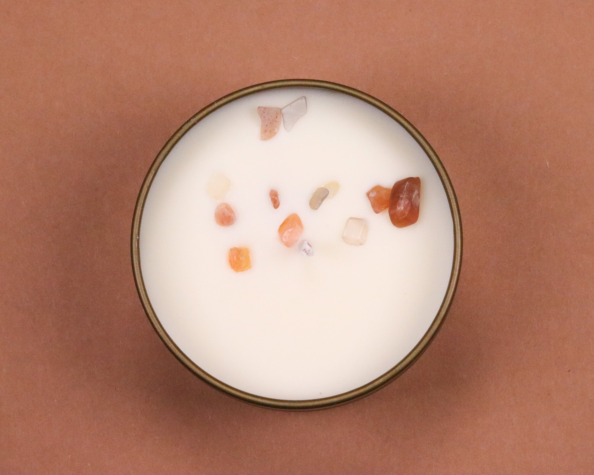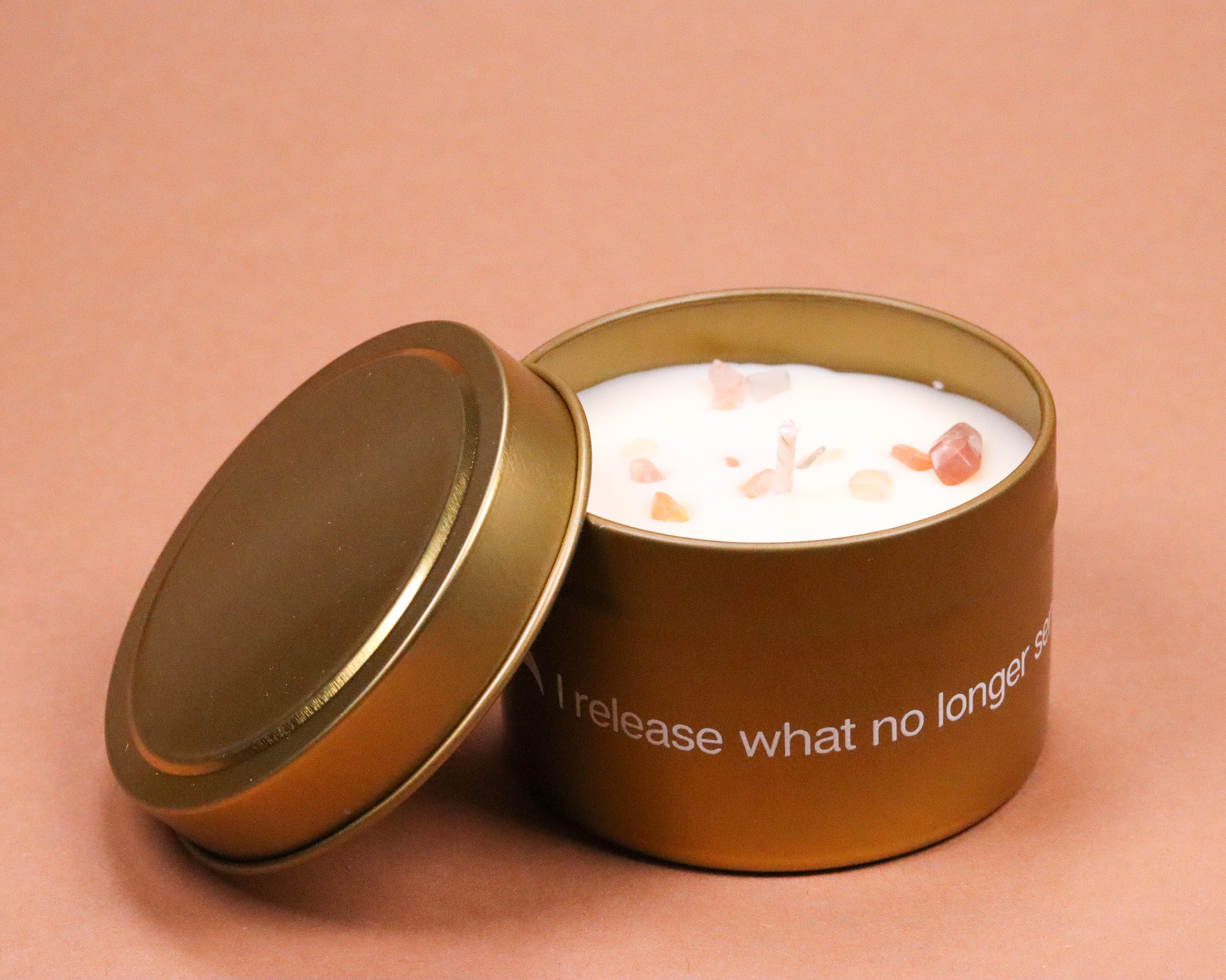 Magische Kerze in einer Dose aus Bio-Sojawachs mit natürlichen, ätherischen Ölen und einem Kristall.