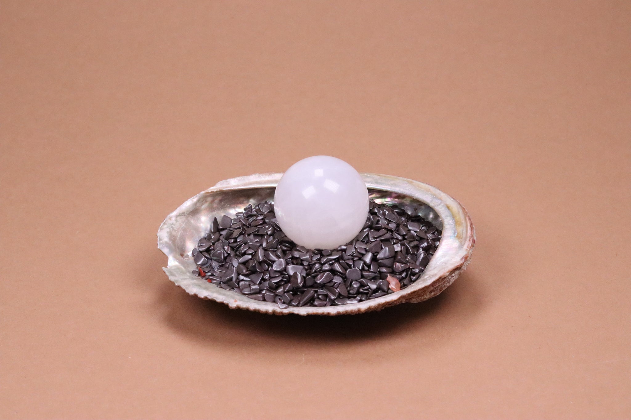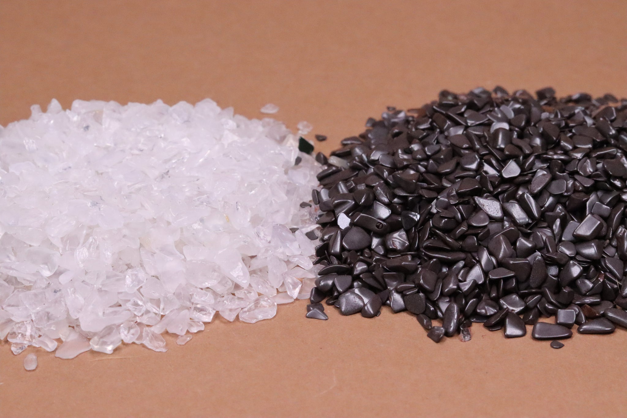 Je 150g Hämatit und 100g Bergkristall in kleinen Beuteln geliefert - ohne Muschel und Kugeln